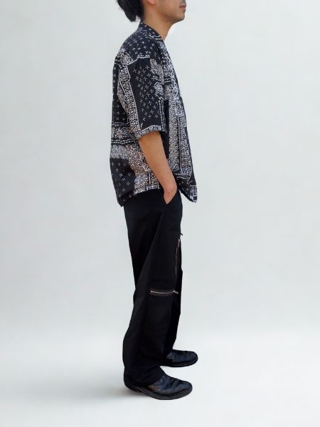 A short-sleeved open-necked shirt in which Yokoo's skulls have been reconstructed and incorporated into a bandana pattern.Plum blossoms, pine trees, and bamboos, symbols of love that coexist with the skull, are scattered throughout the pattern.The material used is a cotton rayon fabric with a taut but moist texture.The fine pattern is carefully expressed one by one at a dyeing factory in Kyoto using a technique called “Bassen”.