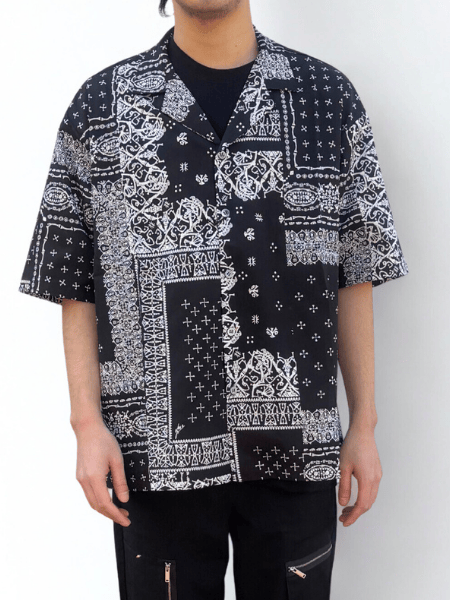 横尾氏の髑髏を再構築しバンダナの柄に落とし込んだ半袖開襟シャツ。